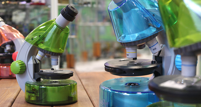 Как и многие детские микроскопы, этот прибор отличается ярким и необычным исполнением. Его корпус выполнен из полупрозрачного пластика, а на выбор представлено пять цветов: