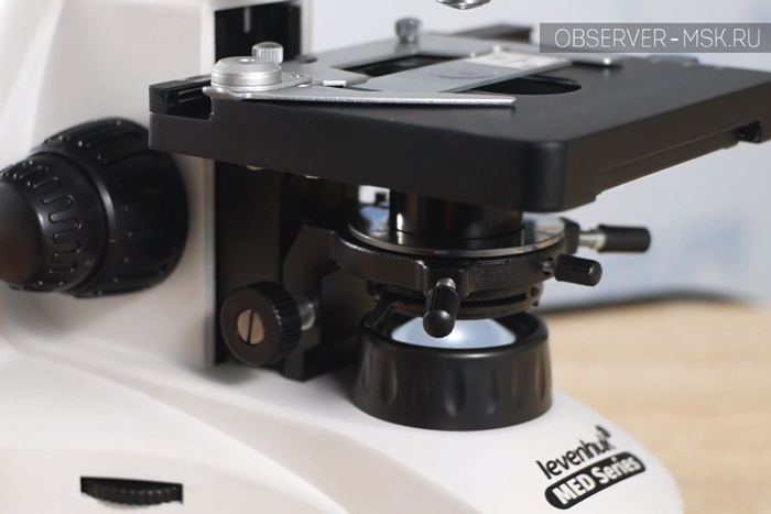 Лабораторный микроскоп Levenhuk MED 10 оснащается достаточно крупным предметным столиком 125х130 мм с предустановленным препаратоводителем, способным плавно перемещать стекло с образцом по двум осям. Фокусировочный механизм двухскоростной, с колесом грубой и тонкой фокусировки, для комфортного наведения резкости на кратностях до 200-300х и от 300х соответственно.