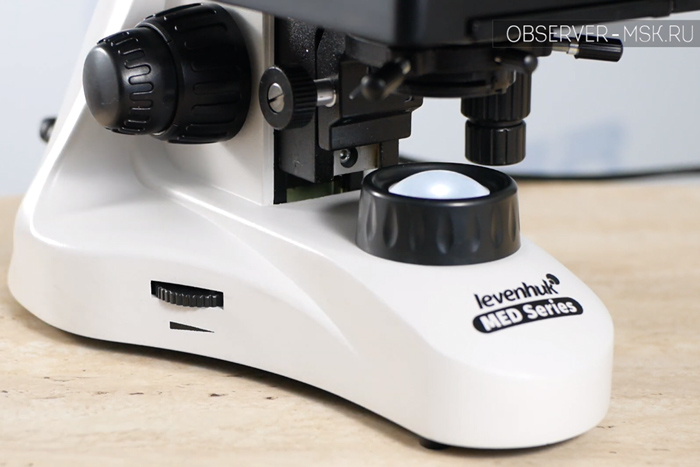 Как и у всех лабораторных микроскопов, подсветка в моделях Levenhuk MED 10 работает только от сети. Светодиодный осветитель, располагающийся под полупрозрачной рассеивающей линзой, испускает плотный холодный свет, прекрасно подходящий в том числе, для работы на высоких кратностях с «темными» объективами, и при этом не нагревает корпус прибора. Уровень его яркости имеет собственную настройку в виде колеса регулировки в основании инструмента.