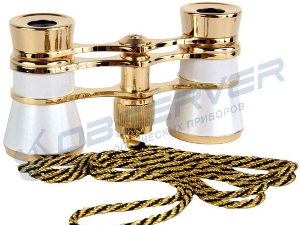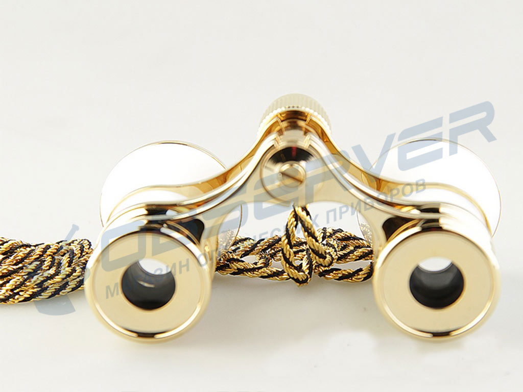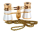 Театральный бинокль классического дизайна: белый корпус бинокля, напоминающий перламутровое покрытие старинных биноклей, в обрамлении под светлое золото. Такая модель будет отлично смотреться в руках дамы в вечернем наряде. В конструкции предусмотрена черно-золотая витая цепочка для ношения на шее.