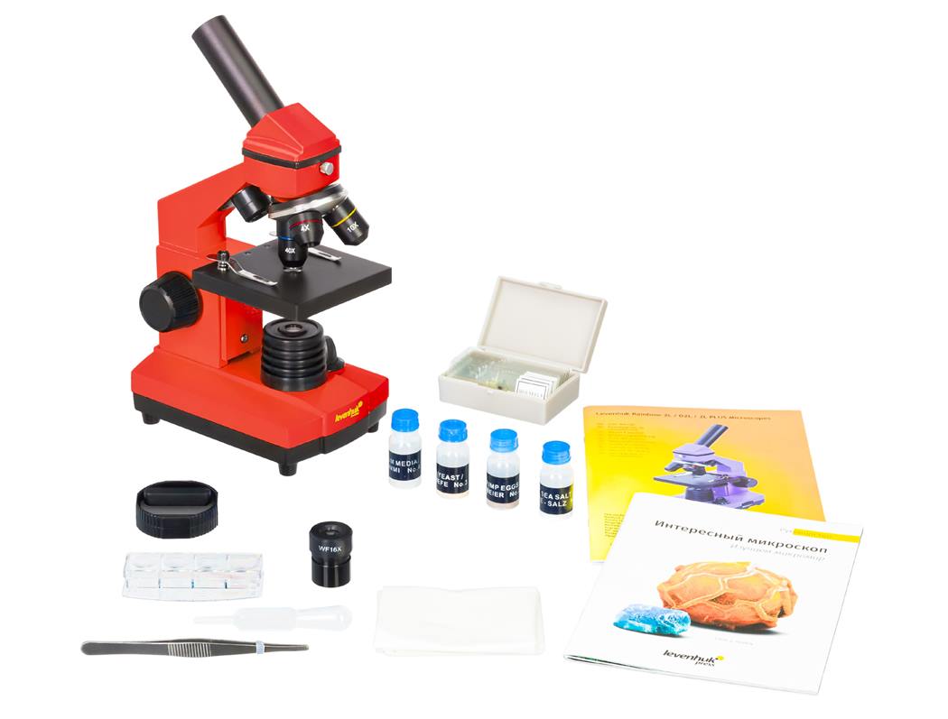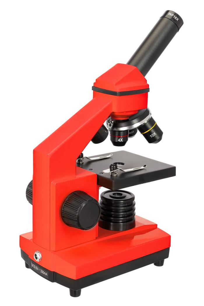 Школьный микроскоп с набором для исследований, который поможет при углубленном изучении микробиологии. Большое увеличение, металлический корпус, яркая подсветка и яркий красно-оранжевый цвет.