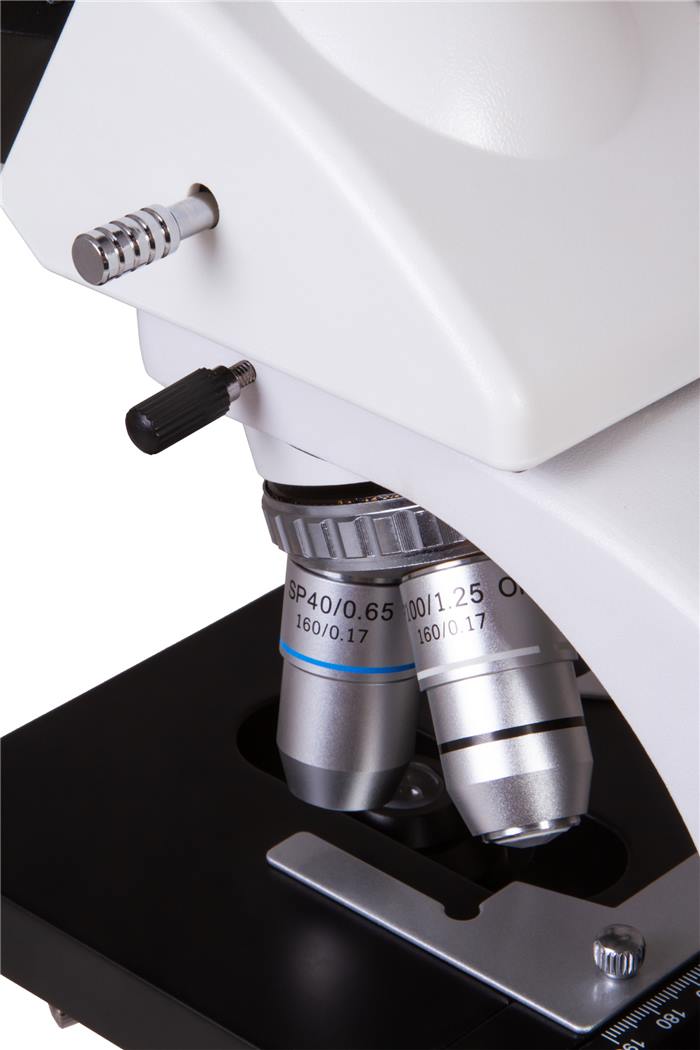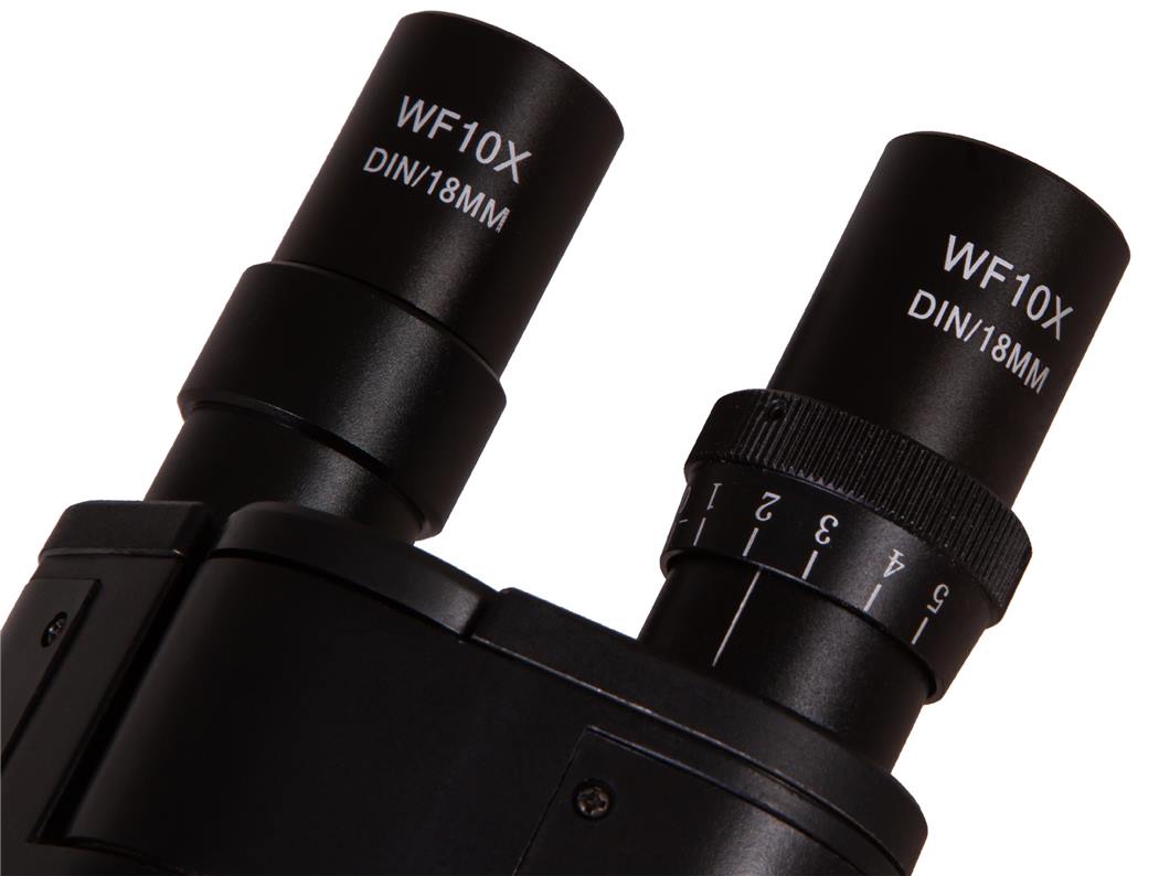 Увеличение. Объективы полупланахроматического типа установлены в револьверное устройство. Комплектные 10-кратные окуляры с широким полем имеют возможность диоптрийной подстройки. Объективы повышенной кратности 40xs и 100xs снабжены защитным подпружиненным механизмом. Оптические элементы имеют слой антигрибкового покрытия.