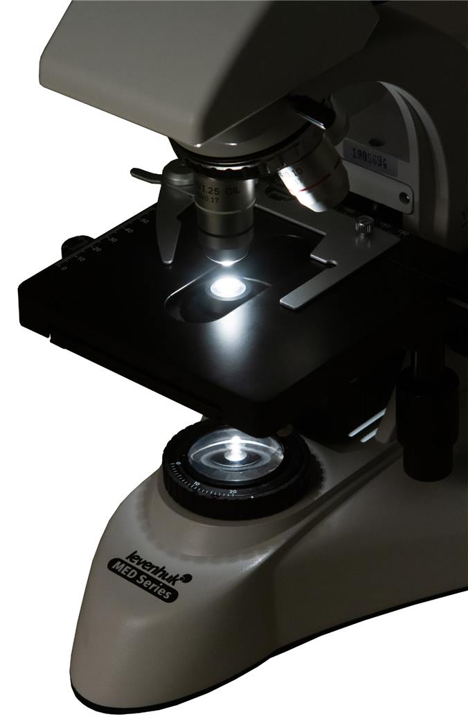 Подсветка. Галогенная подсветка с возможностью регулировки яркости установлена под предметным столиком устройства. Там же располагается и конденсор Аббе с ирисовой диафрагмой. Микроскоп медицинский для лабораторных исследований работает от сети.