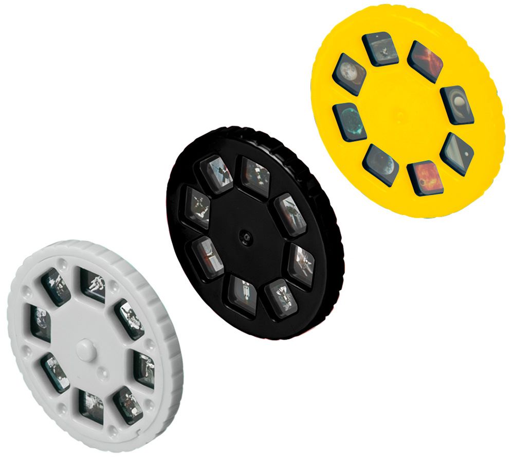Проектор формирует изображения при помощи специальных дисков, вставляемых в устройство. В комплекте 3 диска с 8 изображениями на каждом. При помощи проектора ребенок сможет начать изучать общую информацию по астрономии и космонавтике. Размер проекции составляет 57х48 см, устройство оптимальнее располагать на 2 метрах от стены или потолка, на которые направляется луч проектора.