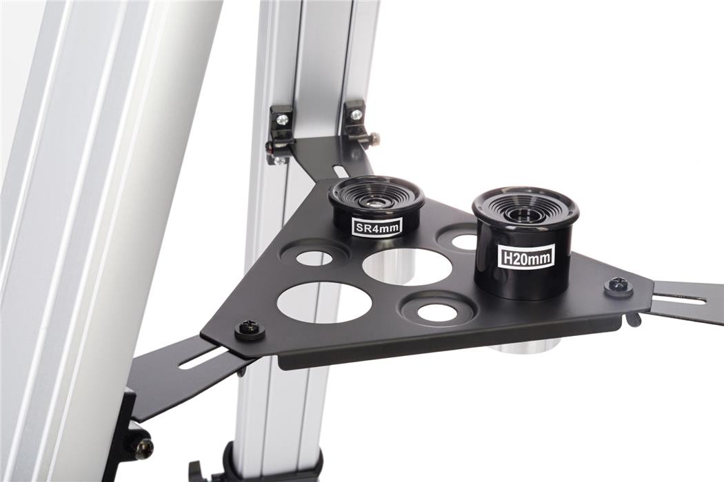 Монтировка. Вилочная монтировка работает в азимутальной ориентации – передвигает трубу по горизонтали и вертикали. По горизонтальной оси управление производится просто руками, а для движения трубы по вертикали можно воспользоваться микровинтом. Алюминиевая тренога имеет складную конструкцию и снабжена столиком-распоркой.