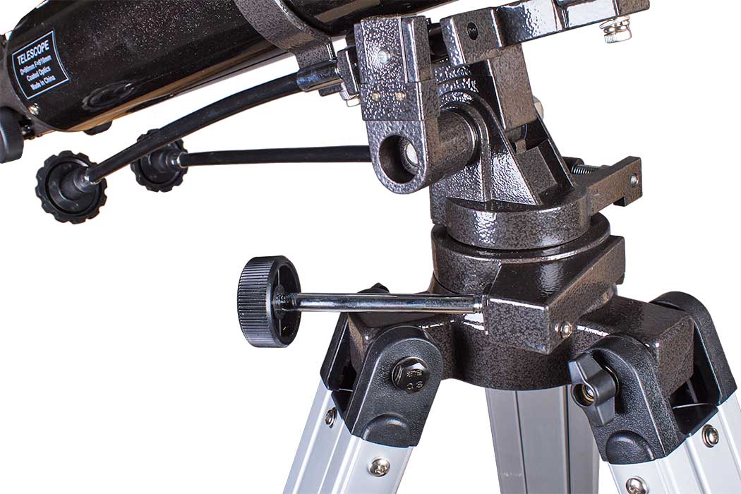 Монтировка. Азимутальная монтировка проста в управлении и легка в освоении. Для регулировки положения трубы используются ручки точных движений по двум осям, а также имеется стопорный фиксатор. Плавное управление позволяет с комфортом наблюдать даже на большом увеличении и заниматься начальной астрофотографией. Вся конструкция установлена на алюминиевый штатив.